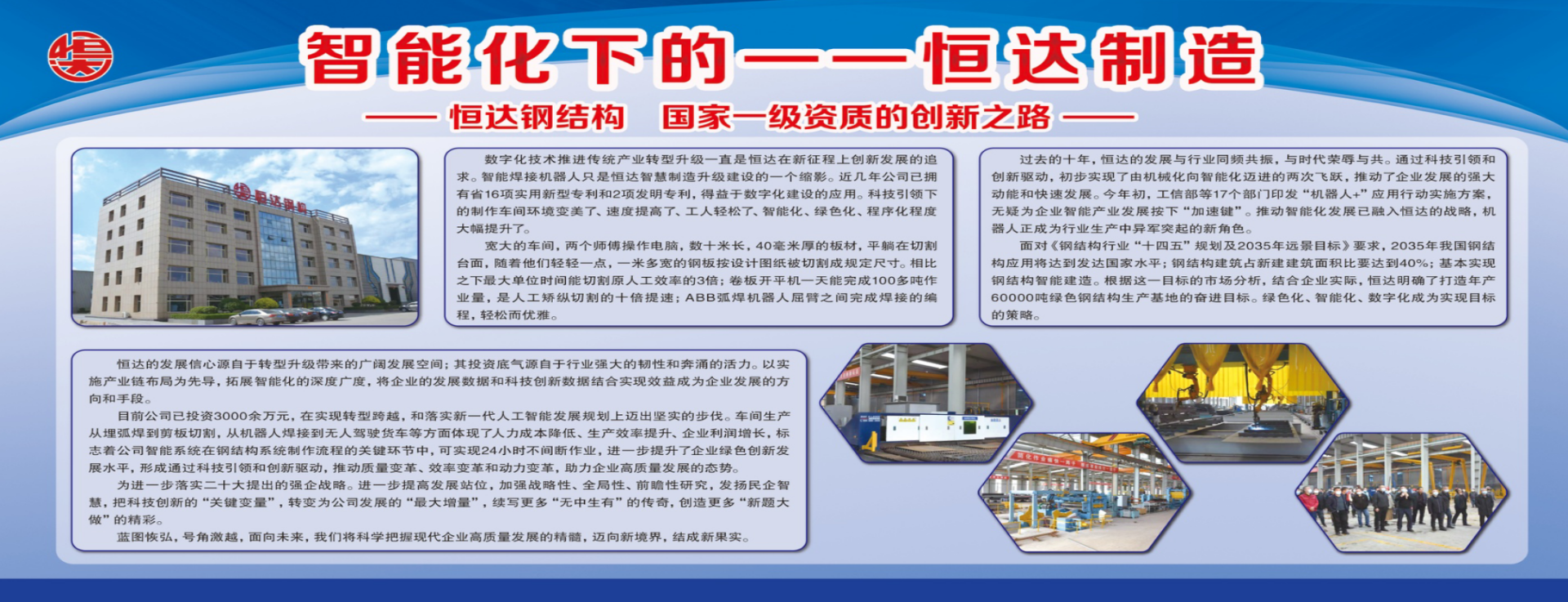 我公司現(xiàn)擁有數(shù)條輕鋼結(jié)構(gòu)加工生產(chǎn)線、重型鋼結(jié)構(gòu)加工生產(chǎn)線、箱型梁柱加工生產(chǎn)線,同時配套有全自動巖棉保溫復合板生產(chǎn)線、高鐵聲屏障、抑風墻生產(chǎn)線,數(shù)控C型鋼生產(chǎn)線及各種規(guī)格的壓型板生產(chǎn)線三十余條,擁有年鋼結(jié)構(gòu)加工8萬噸、鋼結(jié)構(gòu)圍護面積120萬平方米的生產(chǎn)能力, [ 查看詳情 ]
